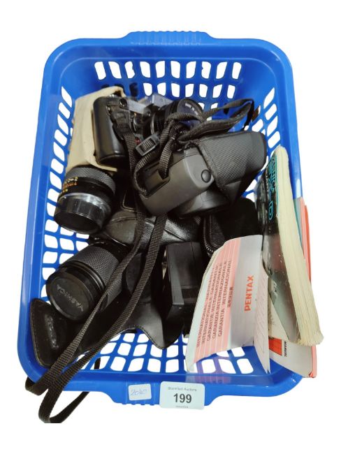 BASKET LOT OF VINTAGE CAMERAS & LENS