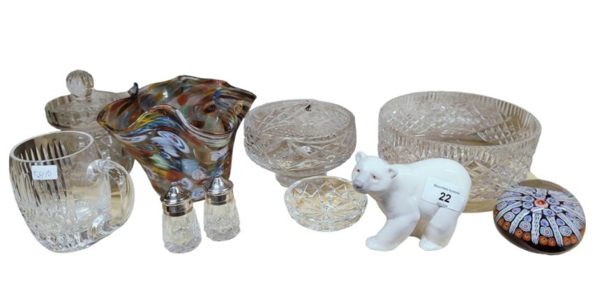 SHELF LOT OF CUT GLASS, LLADRO BEAR AND PAPER WEIGHT